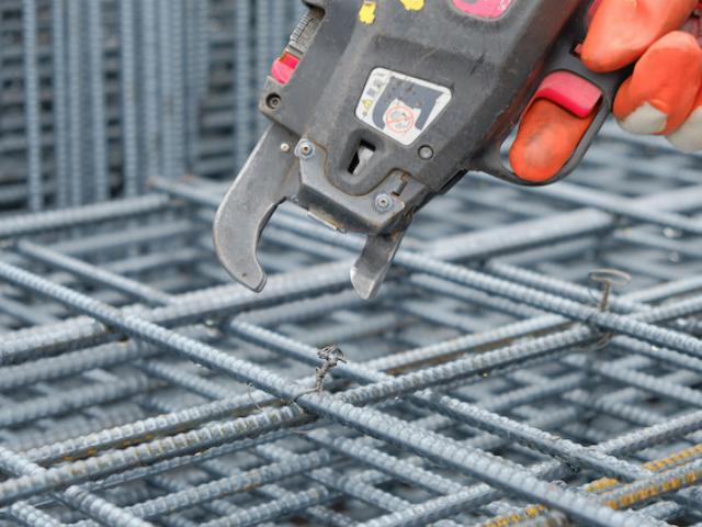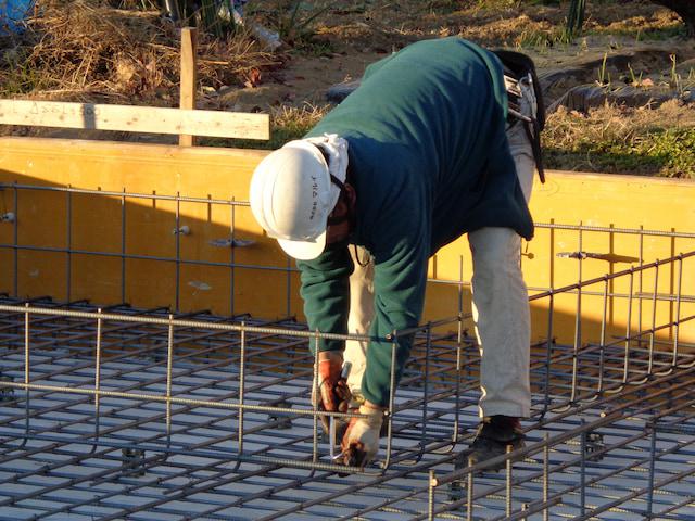 最初は建物の外周から組み始めて、次に床下、壁下の順で進めていきます。組むときは電動結束機という工具を使ってどんどん針金で縛っていきます。