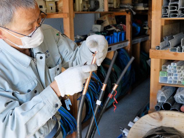 当社は住宅、アパートを始め、工場や企業の事務所、官庁など、さまざまな場所と電源を繋いで、電気を使えるように工事を行う「街の電気屋さん」です。