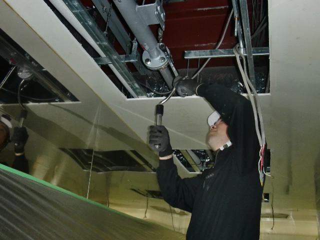 ガス管や空調の場合は、高い場所に配管が設置されていることがあるので、そういう時は脚立を用いて作業を行います。高所の作業は危険が伴いますので、上り下りする場合は、仲間同士声を掛け合ったり、脚立を抑えてあげたりしています。