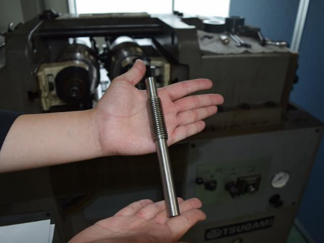 上田市丸子町にあり、80年の歴史をもつ綿谷製作所では、産業機械の部品加工・組立を行っています。ネジ部品の製造装置では、「ダイス」と呼ばれる、ネジの様々な凹凸部分を削り、作り出すための金型もオーダーメイドで製造しています。