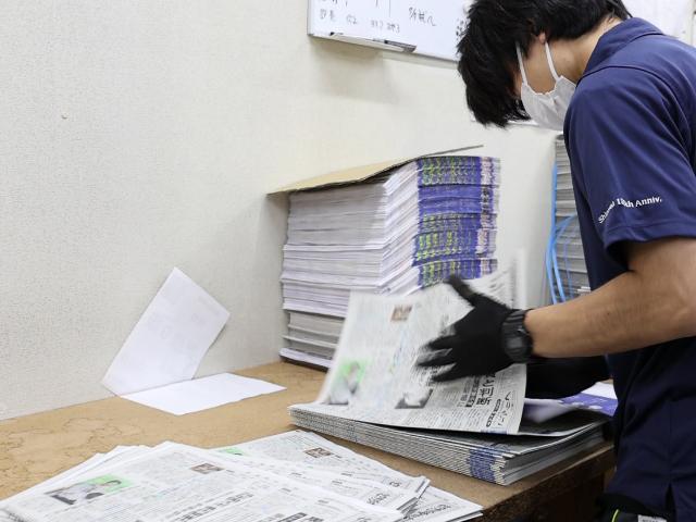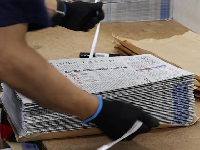深夜1:30ごろ、新聞社から東郷堂本社に届いた新聞を受け取り、本社や作業場で配達準備作業を行います。配達準備は手作業で行います。