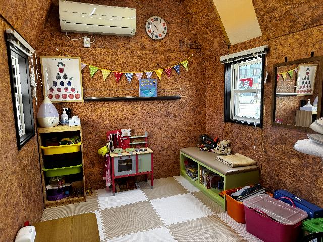 当美容院の託児所は施設のすぐ横に建てられています。オーナーが工夫を凝らし造った建物は内部もこだわっており、屋内には沢山のおもちゃや絵本のほか、お昼寝用の布団も備えられております。