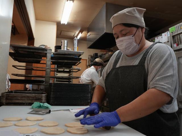 指定の重さに分けられた生地を、めん棒を使って伸ばしていきます。生地の厚みにばらつきがあると、焼いているときに中身がこぼれてしまうので、均等に伸ばすのがポイントです。