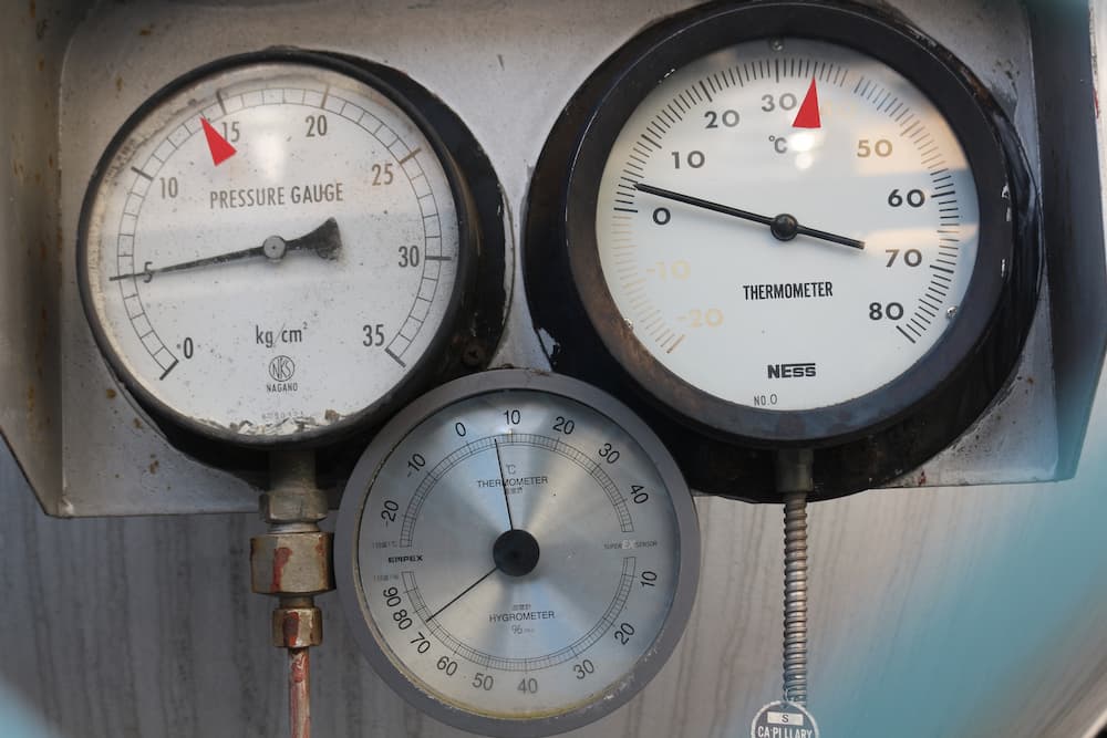 圧力計はガスタンクや電車の運転台や石油やガスのプラント、大きな消火器についています。