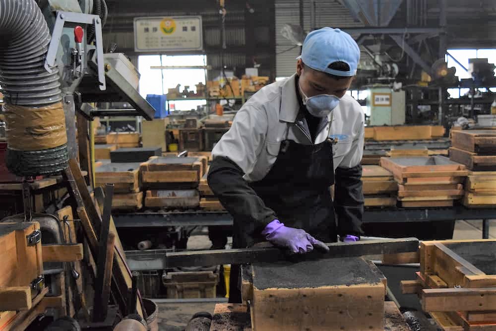 砂型は「手ごね」で作成する場合と、「機械」で作成する場合があります。手ごねの場合、手作業で型を作成するため、求められる技術力も高いですが、その分やりがいも感じられます。