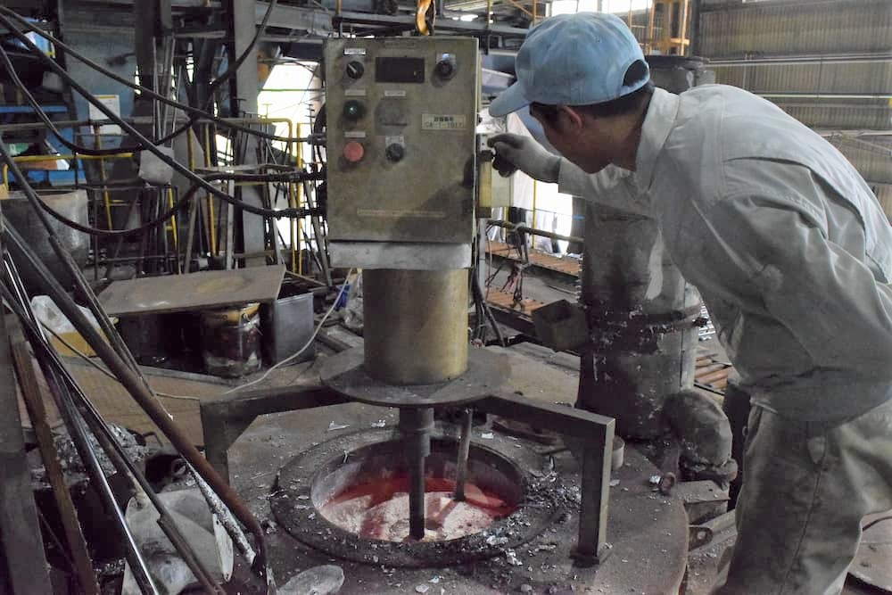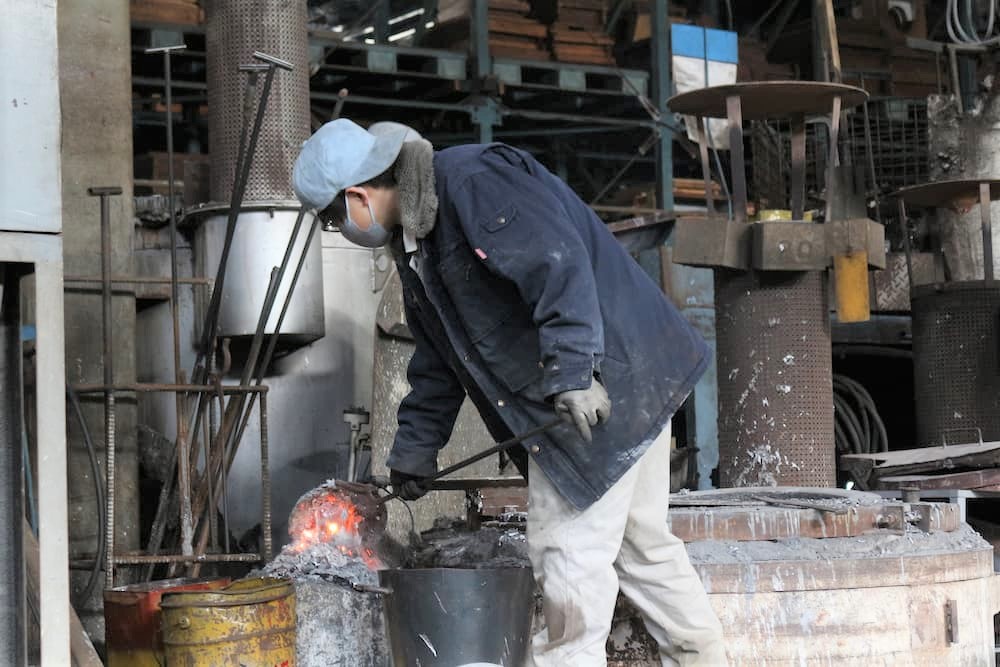 鋳造は型に溶けた金属を流し込むだけで、一見単純な仕事の様に見えるかもしれません。しかし、実際は金属を流し込むスピード、流し込む高さ、抜けていくガスの通り道など、様々な条件を考えなければなりません。砂の中で行われることなので、何度も試してみてうまくゆく方法を探さなければならないこともあります。まさに、感覚や経験がモノをいう仕事です。