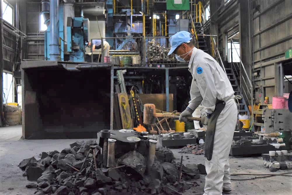 砂型鋳造は、青木村にあるキャステク本社工場で行っています。砂型鋳造は、砂で作った型にドロドロに溶かした金属を流し込み、冷やし固めることで製品を成形していく方法です。砂で作るので複雑な形にも対応できますが、固まって出来た製品を取り出す段階で、作った型は壊してしまうので、大量生産には向いていません。