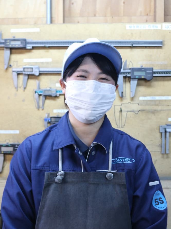 新卒でキャステクに入り、4年間勤めています。製品の外観をみたり、寸法を測ったりして、作られた品物に異常が無いかを検査する仕事をしています。
