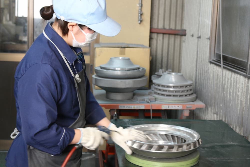 鋳造で製造する製品は、表面はぼこぼこで、寸法も大まかで、ネジの穴なども開いていません。そこで、工作機械を使って寸法を実際の部品の大きさに合わせたり、本来平面にすべき部分を削って平面にしたり、とがった角を曲面や平面で削ったり、ネジ穴を開けたりする作業をしています。