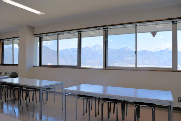小高い斜面にある当社からは、坂城の町や周囲の山々を一望することができます。食堂からの眺めは、当社の自慢の一つです。