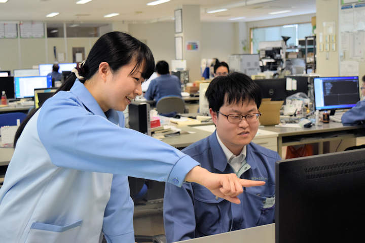 入社後は、社内研修があります。各部署の仕事を回ってどんな仕事をしているか学びました。例えば製品部門では、実際にお客様にお届けする製品の検査や組み立てを行いました。