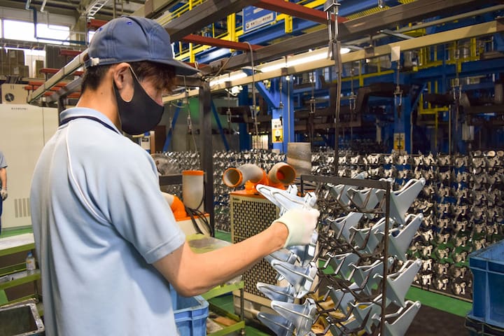 表面処理の加工は機械で行いますので、仕事内容としてはまず金属部品を機械に通すための治具に取り付けます。その後で機械に通し、処理が終わったら治具から取り外し、目視で検査しながら梱包を行います。