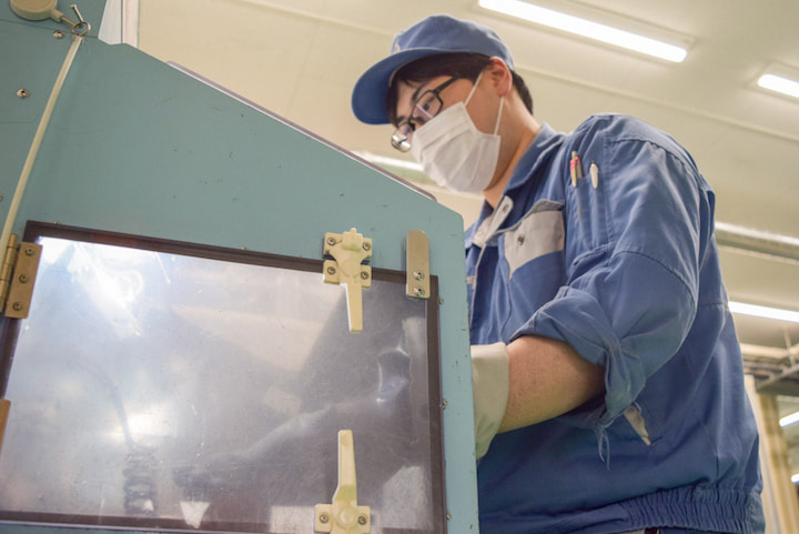 入社してから2か月ほどは、先輩に横についてもらいながら仕事を覚えていました。金属加工=労働場所が暑いというイメージを持つ方もいるかもしれませんが、コーティング事業部では熱を扱う作業がないので夏場でも涼しい中で作業できます。