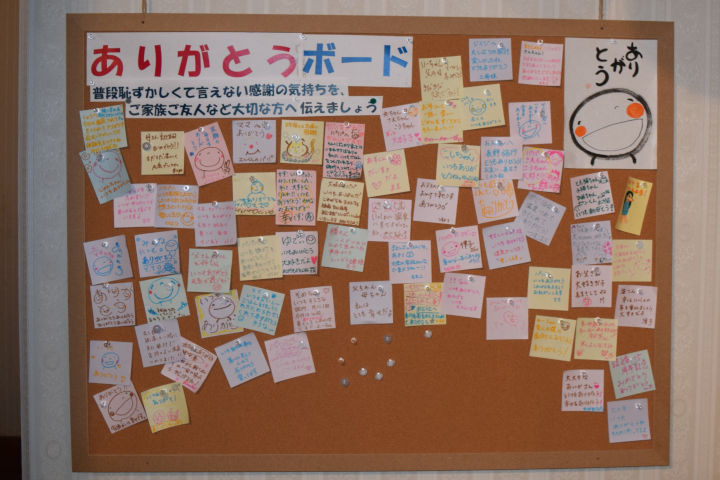 風呂上がりに、普段は恥ずかしくて面と向かって言えないような日頃の感謝の気持ちを付箋につづり、浴場の前に設置されている「ありがとうボード」に貼ることが出来ます。お部屋に戻った後に、お客様同士が普段の感謝を伝えるキッカケになればよいと考え、始めた企画です。