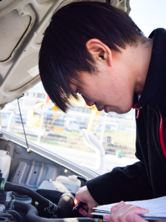 来店されたお客様への対応が主な仕事です。車を買いたい、修理をしたい、売りたいなど、お客様の要件を伺って、それを処理します。他にも、車検や定期点検の時期が近づいたときにはお客様へ電話でお知らせしています。法人契約の仕事もしていて、お客様の元へ伺い、車検・点検の手続きや引き取りなども行っています。