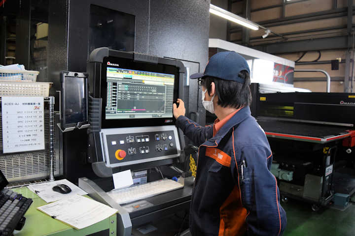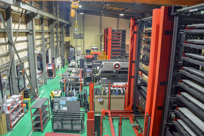 吉見鈑金製作所の現場は油汚れ一つなく、オフィスビルの中のような床の上に、最新鋭の巨大な工作機械がずらっと並んでいます。それがずらっと並ぶ光景には思わずテンションが上がってしまいます。