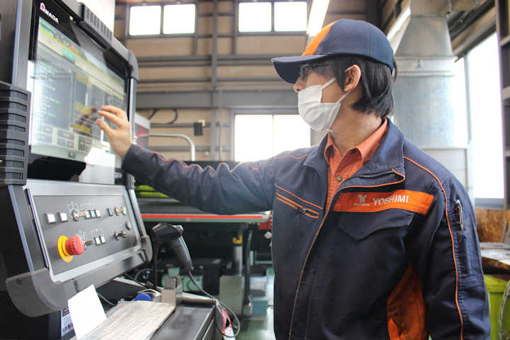 ブランク工程を担当しています。ブランクでは、まず機械に金属の板をのせます。板の大きさや枚数は様々あって、数が多いと大変です。次に指示書を機械に読み込ませ、画面を操作して板の加工を行います。そして出来上がったものを機械から下ろし、ちょうどプラモデルのパーツを取り外すように、板から各パーツを取り外していきます。最後に、出来上がったものを次の工程に回します。