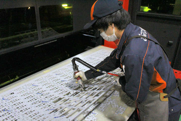 ブランク工程では、実際に材料の金属の板を切ったりくり抜いたりします。この工程は特に機械による自動化が進んでいて、バーコードを読み込むだけで、ほとんどの加工は機械が行ってくれるので、大変な作業や危険を伴う作業は少なくなっています。ただの板が機械を通ると、様々な形になって出てくる様子は、見ていてとてもおもしろく、飽きません。