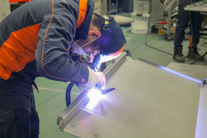 溶接工程では、ブランク工程で金属の板から切り出されたパーツを接合します。これでかなり最終的な製品の形に近づきます。呼吸を整え、一定のリズムでぱちぱちっとくっつけていきます。溶接には簡単なものも難しいものもあるので、最初は簡単なものから始め、少しずつ難しい溶接に挑戦していき、だんだんと上手になっていきます。