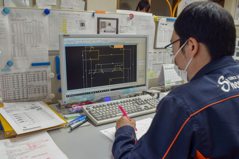 製造一課の課長としてマネジメントや人間関係の管理、現場の進捗管理、お客様からの製品についての電話対応なども行っています。以前はCADを用いた作図の仕事を主にしていました。現在ではCADばかりではなく、現場の管理、そして部下に仕事を教えることをしています。